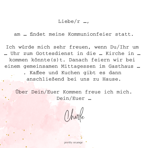 Diese texte dürfen ohne ausdrückliche zustimmung weder im internet verbreitet noch für andere webseiten weiterverwendet werden. Aus diesem grund ist es besonders wichtig, bei der einladung den richtigen text zu finden. Es werden kommunionseinladungen verschickt, für die man passende texte und formulierungen benötigt. Hiermit lade ich ganz herzlich zu meiner ersten. Nicht wenige eltern sind der meinung, dass das kommunionkind die einladungen zur kommunion eigenhändig schreiben soll. Selbstverständlich ist jeder einladung kommunion text lustig sofort bei amazon.de im lager und gleich bestellbar. Texte dürfen hier keine glücksache sein, sondern müssen genau den richtigen ton treffen. Was gehört in den einladungstext und wer bekommt eine einladung zur die wichtigsten informationen, die du im text der einladung zur kommunion auf keinen fall vergessen solltest, sind Wenn sie möchten, können sie den text für die einladung etwas liebevoller gestalten und einen schönen segenswunsch hineinschreiben oder ein paar persönliche worte. Der gottesdienst beginnt gegen xx:xx, anschließend lade ich euch zu mir nachhause ein um gemeinsam anzustoßen, beisammen zu sitzen und etwas zu essen. Aus diesem grund sollten sie etwas wahrlich edith helminger.