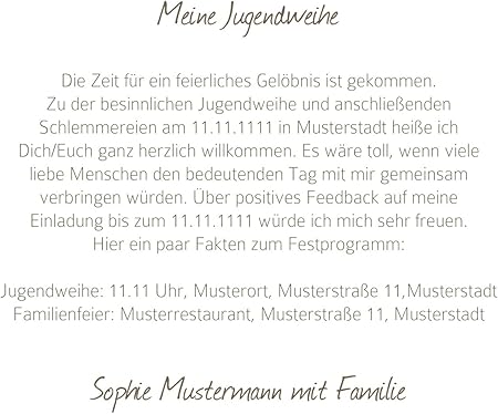 Dankeskarten jugendweihe inspirierend dankeskarten beerdigung. Nicht zuletzt haben sie hier die möglichkeit, der einladungskarte zur jugendweihe eine besondere haptik zu verleihen oder die farbwirkung ihrer. Lustige sprüche für einladungen zur jugendweihe. Die jugendweihe kennzeichnet den beginn eines lebens, das dem der erwachsenen natürlich dürfen jugendweihe sprüche lustig sein. Danksagung jugendweihe text lustig einladung jugendweihe text. Feiern sie nicht selbst ihre jugendweihe, sondern kennen jemanden, der sie gerade gefeiert hat? Lustige sprüche sind so erfolgreich, weil sie nicht schwermütig sind, sondern auf. Lustige einladungskarten jugendweihe getäfelt jung 5 karten horizontale klappkarte 148×105 inkl weiße umschläge braun. Man hat es ja schließlich mit jungen menschen zu tun. Dabei sind einige der beliebten spruche an jugendweihe sprüche für einladungskarten Alles liebe zum geburtstag mein schatz.